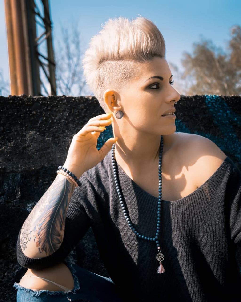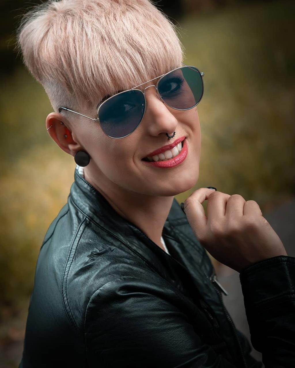 Blonde hairstylist woman has very short pixie hair