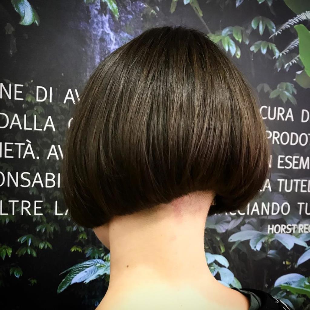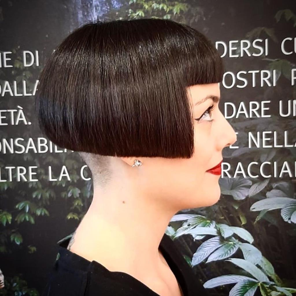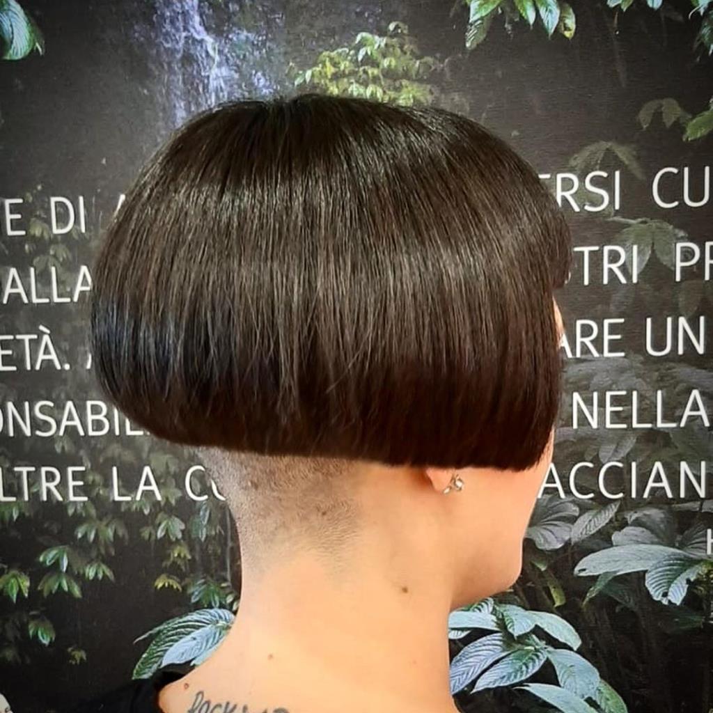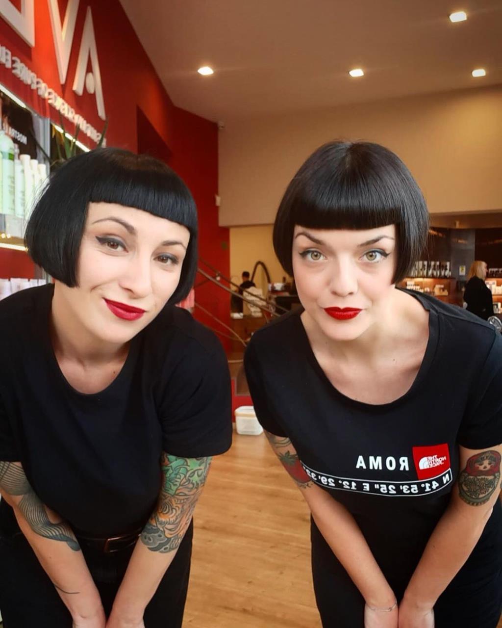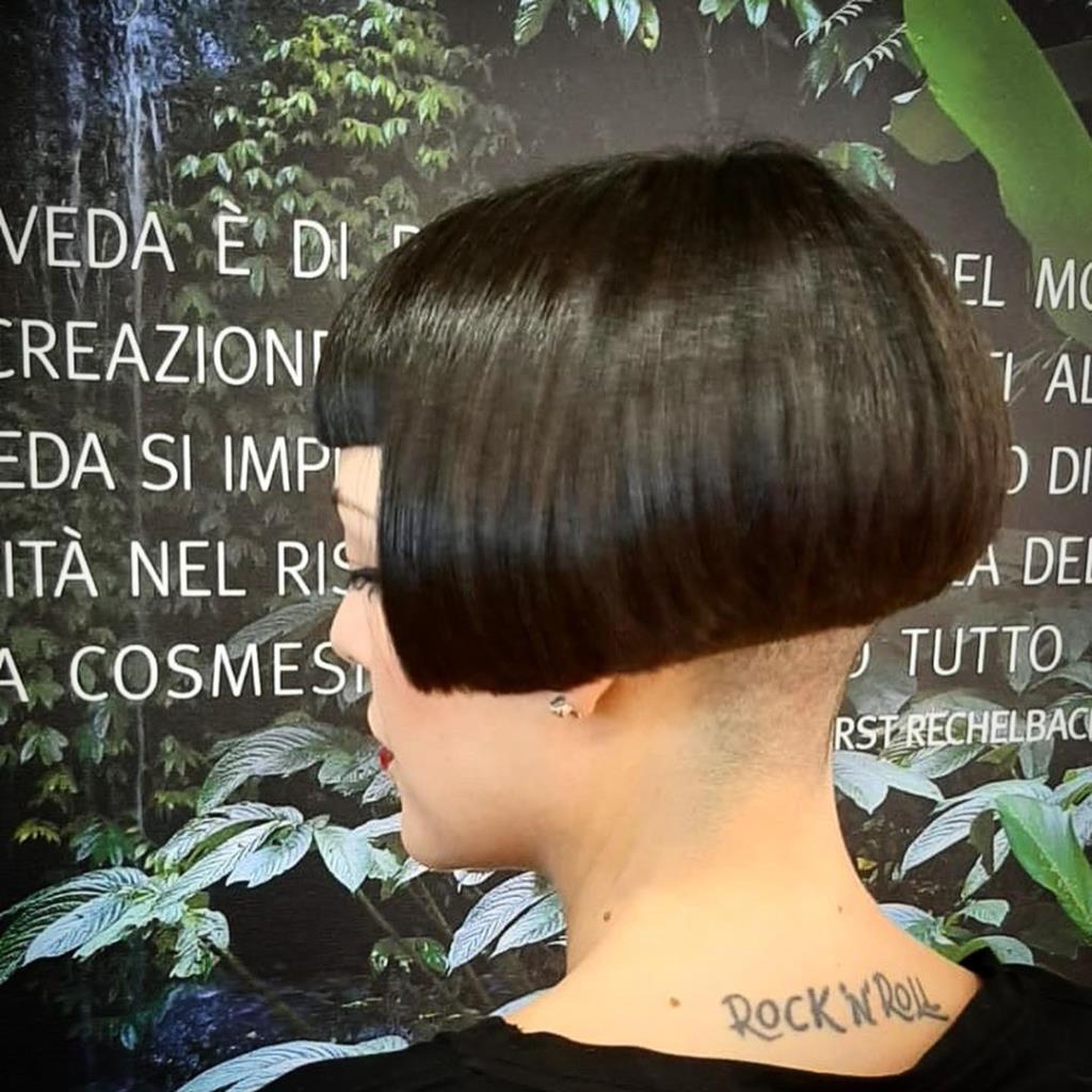 Two hot babe has black short classic bob and shaved nape.