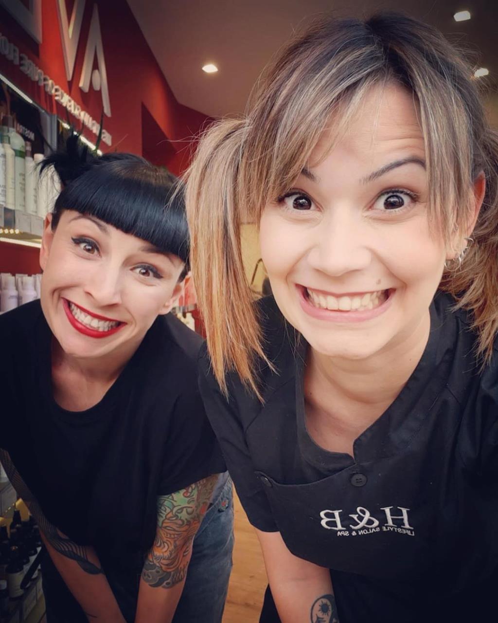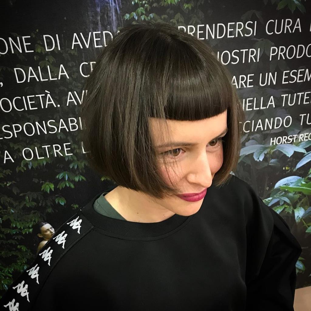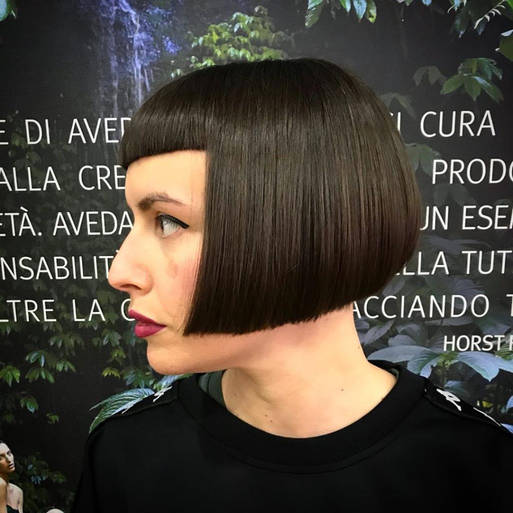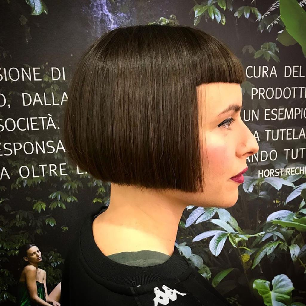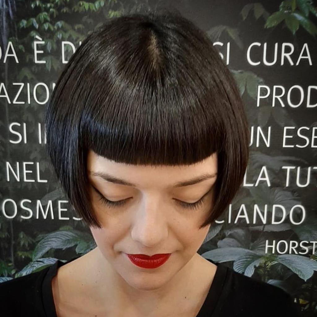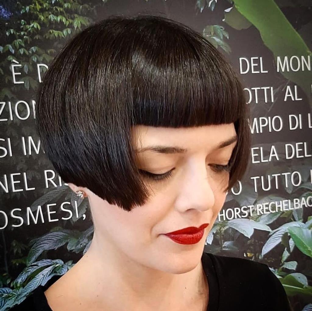 Two hot babe has black short classic bob and shaved nape.